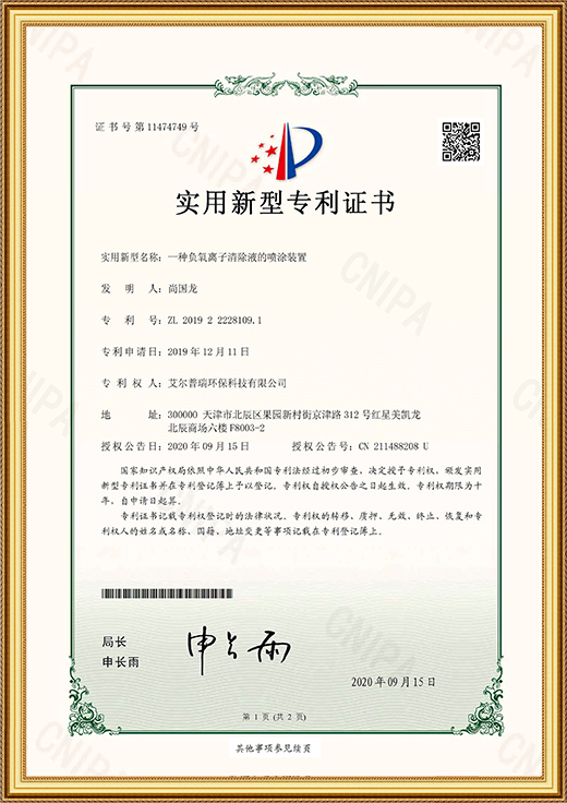 • 實用新型專利證書(一種負氧離子清除液的噴涂